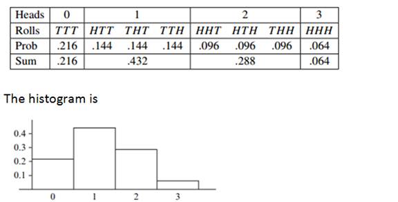 Sample Problem1.1 Supposed a biased coin has a 40% probability of landing heads on any throw. In an experiment, the coin is tossed three times and the number of heads is recorded. Find the probability distribution of the result and draw the histogram for this probability distribution.