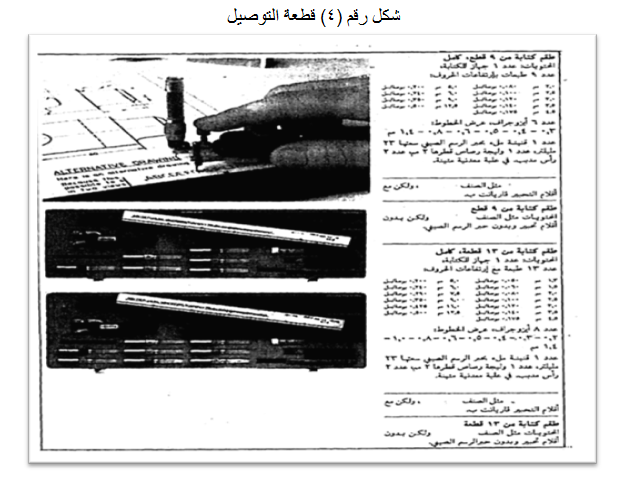 ولضمان كتابة سليمة واستخدام مناسب لهذه المساطر ينبغي الاستعانة بريشة التوصيل الموجودة بطاقم الرابيدوجراف والذي يمكن عن طريق استخدامها نضمن ان يكون قلم الرابيدوجراف في وضع رأسي تماماً أثناء الكتابة. انظر الشكل رقم (4).