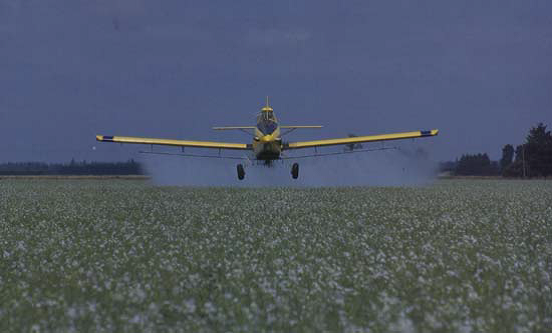 استخدمت الطائرات في مكافحة الآفات الزراعية عام 1925 وتستخدم لرش (المساحات الواسعة) ويستعمل لهذا الغرض مبيدات مجهزة بطريقة خاصة وكي ترش بأسلوب يسمى بالرش بالحجم المنتهي القلة يو. ال. في حيث يتم فيها تفتيت حبيبات المبيد عالي التركيز الى درجة حبيبات تقارب الضباب. ومزايا استعمال الطائرات في المكافحة:
