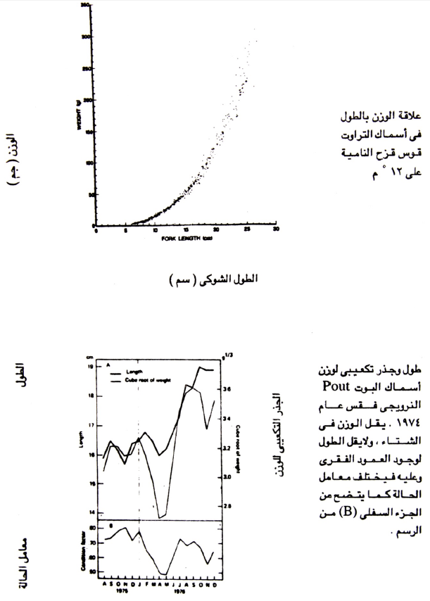 2- الحجم والعمر Size- at – Age: ودائما يرتبط وصف النمو بأحجام الافراد عند الاعمار المختلفة, فالعلاقة بين الطول والعمر Length- at- Age يمكن تطبيقها للحصول على مقياس نمو مثل معامل الحالة Condition Factor (k) وطول السمك (L) والذي يمكن استخدامه لوصف ومقارنة معدلات النمو. ومعامل الحالة او العلاقة بين الوزن (W) والطول في الاسماك يأخذ شكلا منحنيا يختلف شكلة وميلة Slope باختلاف الانوع والعشائر والمواسم والاجناس والتغذية ودرجة الحرارة. ويعبر عن معامل الحالة (او دليل الوزن Ponderal index) بالمعادلات
