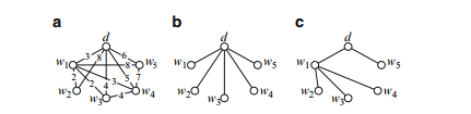 Once the pipelines in case (c) have been built, there is no reason to build a direct connection from d to w3. Any oil being sent from w3 to the depot can be relayed through w1. Similarly, there would be no point in building a pipeline joining w3 to w4. The conditions of the problem imply that the graph does not need to contain any cycle. However, it must be connected. So the solution is to find a spanning tree.