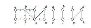 As an example, consider the graph on the left of Fig. 1.2. The cheapest edge is e f , cost 1. The next cheapest cost is 2, and we can choose any one of f g, b f or bg. Say we select f g. For the third edge we can choose either b f or bg; whichever one is chosen, the other will no longer be available, because we need to avoid the cycle bfg. We shall select f g. There are two edges of cost 3, namely cg and dg. We shall use cg. Then dg is still available, so we choose it for the fifth edge. At cost 4, there are four choices: dg, gh, ab, and ae. Say we select dh; then gh must be eliminated.