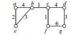 Solution. We start by listing the edges in order of cost: de, cost 1; be, cost 2; c f , cost 3; ab, cost 4; ad, cost 5; bc and e f , each cost 6. The first edge chosen is de.