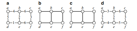 Next is be, then c f , then ab, cost 4. The next cheapest is ad, but it is not allowed because it would form the cycle abed. So we go on to either bc or e f , either may be chosen, and there are two possible solutions, both of total cost 16. They are shown in Fig. 8.3, graphs (b) and (c).