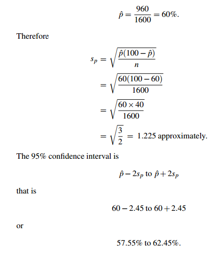 Sample Problem 1.1 In a survey of 1600 voters, 960 say they intend to vote Democrat at the next election. What is the 95% confidence interval for the percentage of voters who will vote Democrat?