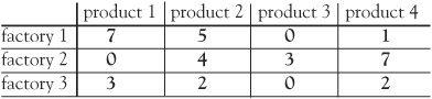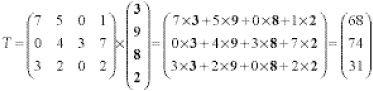 Look carefully and you’ll see the row by column multiplication, an essential feature of matrix multiplication. If in addition to the unit profits we are given the unit volumes 7, 4, 1, 5 of each unit of the products, in one fell swoop we can calculate the profits and storage requirements for the three factories by the single matrix multiplication: