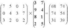 Easy enough. Sadly, matrix multiplication is less obvious. Returning to the AJAX company, suppose the unit profit of its four products are 3, 9, 8, 2. We can certainly compute the overall profit for Factory 1 with outputs 7, 5, 0, 1 of its four products. It works out as 7 × 3 + 5 × 9 + 0 × 8 + 1 × 2 = 68.