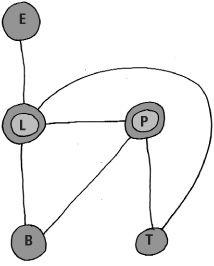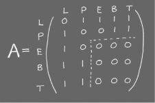 Another example of using matrices is in the analysis of a flight network for airlines. This will involve both airport hubs and smaller airports. In practice this may involve hundreds of destinations – here we’ll look at a small example: the hubs London (L) and Paris (P), and smaller airports Edinburgh (E), Bordeaux (B), and Toulouse (T) and the network showing possible direct flights. To use a computer to analyse such networks, they are first coded using matrices. If there is a direct flight between airports a 1 is recorded at the intersection of the row and column labelled by these airports (like from London to Edinburgh). The ‘connectivity’ matrix which describes the network above is A.