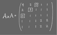 The lower submatrix (marked out by the dotted lines) shows there are no direct links between the three smaller airports. The matrix product A × A = A2 of this matrix with itself can be interpreted as giving the number of possible journeys between two airports with exactly one stopover. So, for example, there are 3 possible roundtrips to Paris via other cities but no trips from London to Edinburgh which involve stopovers. The number of routes which are either direct or involve one stopover are the elements of the matrix A + A2. This is another example of the ability of matrices to capture the essence of a vast amount of data under the umbrella of a single calculation.