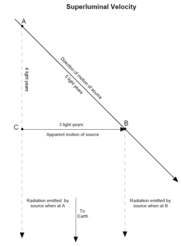 Suppose A is 4 light years (LY) farther from Earth than B (that is, AC is 4 LY). Moving just a bit under the speed of light, the object takes just over 5 LY to travel from A to B. However, the radiation it emitted at A reaches C in 4 years. As that radiation continues toward Earth, it is one year ahead of the radiation emitted toward us by the object when it arrived at B. When it finally (after several billion years) reaches Earth, the radiation from A is still one year ahead of the radiation from B. It appears to us that the object has moved tangentially out from the center of the quasar, from C to B and (from the Pythagorean theorem) has gone 3 LY in just over one year! That the object appears to travel at nearly three times light speed is only because of the projection effect, with its radiation travelling from A to C in 4 years, while the object itself went from A to B in 5 years.