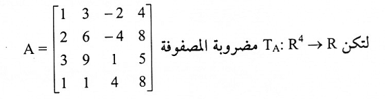 لإيجاد null (A) يجب أن نوجد بعد فضاء الحل للنظام الخطي المتجانس AX = 0 وبحل هذا النظام باختزال المصفوفة الممتدة للشكل المدرج السفي المختزل، سنحصل على المعادلات الآتية: