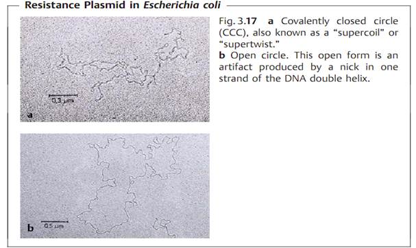 A bacterium's genetic information is stored in its chromosome and plasmids. Each of these structures is made of a single DNA double helix twisted to the right, then additionally twisted to the left about its helical axis ( Fig. 3.17). Plasmids consisting of linear DNA also occur, although this is rare. This DNA topology solves spatial problems and enables such functions as replication, transcription, and recombination. Some genes are composed of a mosaic of minicassettes interconnected by conserved DNA sequences between the cassettes .