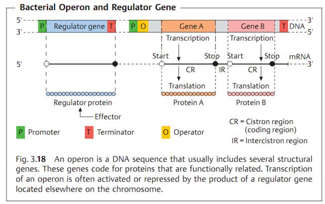 - Transcription. Copying of the sense strand of the DNA into mRNA. The continuous genetic nucleotide sequence is transcribed “colinearly” into mRNA. This principle of colinearity applies with very few exceptions. The transcription process can be broken down into the three phases promoter recognition, elongation, and termination. The promoter region is the site where the RNA polymerase begins reading the DNA sequence. A sigma factor is required for binding to the promoter. Sigma factors are proteins that associate temporarily with the RNA polymerase (core enzyme) to form a holoenzyme, then dissociate themselves once the transcription process has begun, making them available to associate once again. Specific sigma factors recognize the standard promoters of most genes. Additional sigma factors, the expression of which depends on the physiological status of the cell, facilitate the transcription of special determinants. Genes that code for functionally related proteins, for example proteins that act together to catalyze a certain metabolic step, are often arranged sequentially at specific locations on the chromosome or plasmid. Such DNA sequences are known as operons (Fig. 3.18). The mRNA synthesized by the transcription of an operon is polycistronic, i.e., it contains the information sequences of several genes. The information sequences are separated by intercistronic regions. Each cistron has its own start and stop codon in the mRNA.