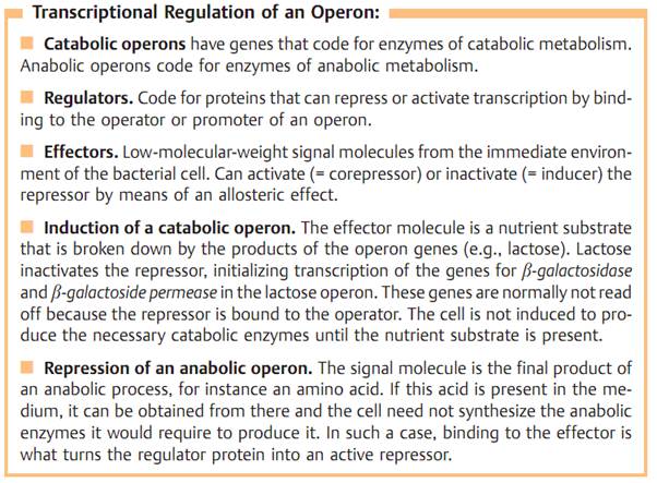 Bacteria demonstrate a truly impressive capacity for adapting to their environment. A number of regulatory bacterial mechanisms are known, for example posttranslational regulation, translational regulation, transcription termination, and quorum sensing. The details of all these mechanisms would exceed the scope of this book. The most important is regulation of the initiation of transcription by means of activation or repression, a process not observed in this form in eukaryotes: a single gene, or several genes in an operon at one DNA location, may be affected (see Fig. 3.18). The mechanism that has been investigated most thoroughly is transcriptional regulation of catabolic and anabolic operons by a repressor or activator.