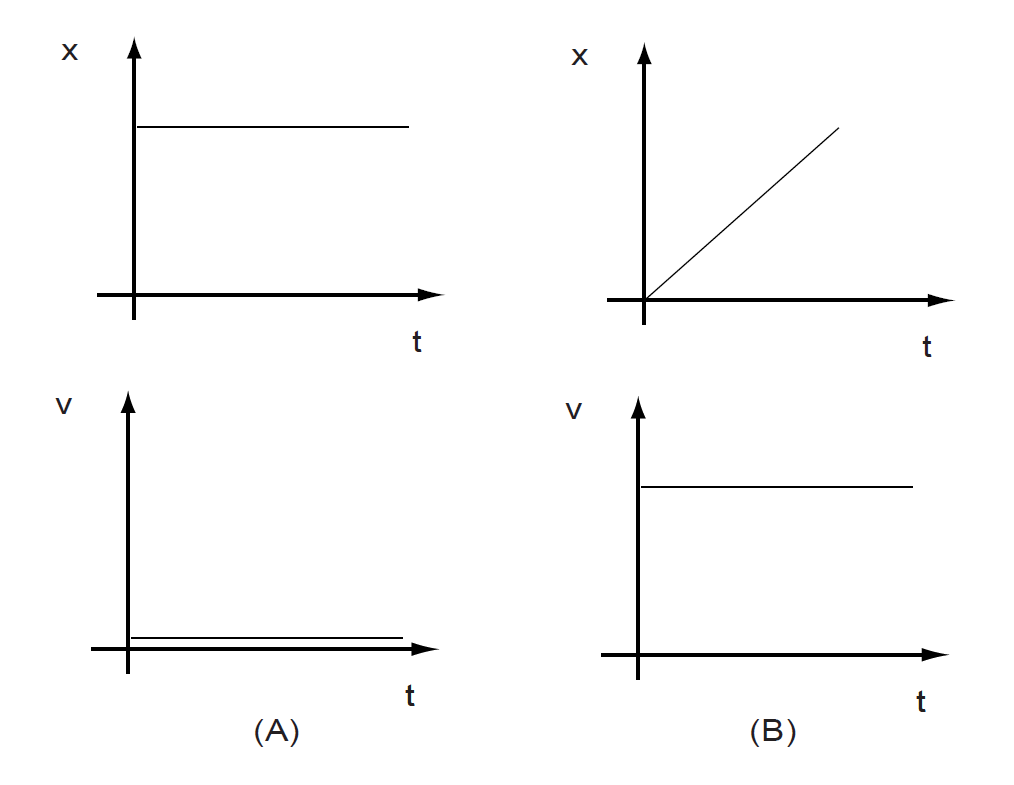 FIGURE 2.1 Position - time and Velocity - time graphs for (A) object standing still and (B) object moving at constant speed.