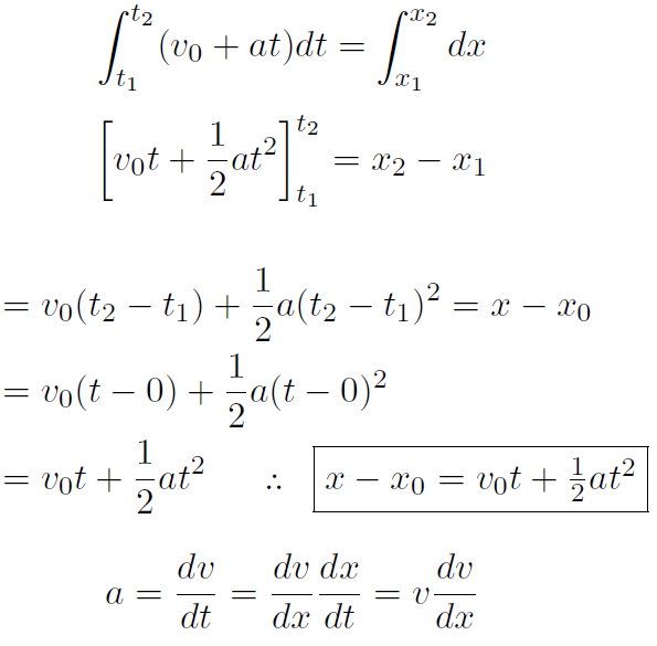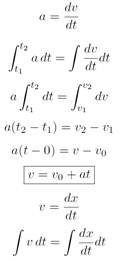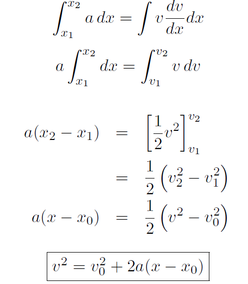 (This section is only for students who have studied integral calculus.) The constant acceleration equations can be derived from integral calculus as follows. For constant acceleration a ≠ a(x), a ≠ a(t)