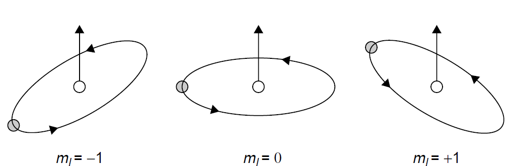 We have now described the orbital angular momentum of an electron with the term l, but an electron with angular momentum is analogous to a current loop and will exhibit a magnetic moment. This magnetic moment will (generally speaking) be characterized by the magnetic quantum number ml. An alternative way to think about this parameter is that it represents the direction of angular momentum of an electron. Assuming that we’ve chosen an axis for the atom, the orientation of this angular momentum (or orbital) with respect to this axis gives rise to ml. It can be thought of as the three-dimensional tilt of an elliptical orbit, as depicted in Figure1.1. This number is confined by the orbital quantum number l and may assume integer values ranging from -l to l. For example, an s orbital with l = 0 always assumes a magnetic quantum number of ml =0, while a p orbital with l =1 can have numbers ml = -1, 0, or 1. The range of numbers increases as the orbital does, with five values possible for a d orbital, and so on. In all, there are -l+1 possible values for ml for a given value of l.