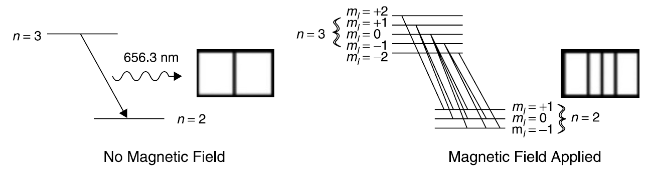required to produce an energy difference between levels with various values for ml. Under the influence of a magnetic field, certain spectral emission lines can be split into a number of hyperfine lines in what is called the Zeeman effect. Figure 1.2 depicts the effect of an external magnetic field on the red emission line of hydrogen.