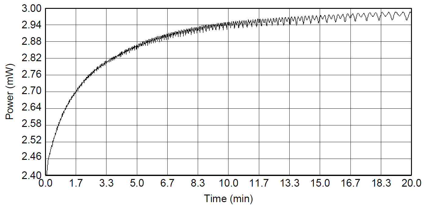 The output of a HeNe laser is not immediately stable, as Figure 1.1 shows. At zero a cold HeNe laser tube with a typical output power of 3 mW(and a maximum rated output of 4 mW) was switched on. Lasing output appears almost immediately and rises quickly to a reasonable level, reaching 80% of the final output power in less than 10 s. As the laser warms up, the output power asymptotically approaches the final value of almost 3 mW, but oscillatory behavior is seen in the output power, which varies almost 2% at a period that gradually becomes longer (the period is seen to be 34 s after the laser has been operating for 15 minutes). This behavior eventually disappears as the laser is operated, and for utmost stability it was found that two days was not an