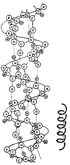 يتشكل التركيب الثانوي للجزيئات البروتينية من خلال التواء السلسلة للبتيد المتعدد بحيث تعطي أشكالاً نوعية تثبت بواسطة الروابط الهيدروجينية، وقد أثبتت الدراسات بأشعة أكس ان معظم الجزيئات البروتينية الطبيعية يلتف جزء من سلسلتها على هيئة لولب يميني الاتجاه كل دوره منه مؤلفة من (3.6) وحدة من الاحماض الامينية تتجه مجاميعها الجانبية (R) حول محيط اللولب (الحلزون) بعيداً عن محوره. وضمن هذا التركيب الملتف تأخذ مجاميع الكاربونيل ( - C = 0) والأميد (-NH) اتجاهات محددة تتيح المجال لتكوين الروابط الهيدروجينية، بحيث تكون مجموعة الأميد رابطة هيدروجينية مع مجموعة الكاربونيل التي تحتها، وروابط هيدروجينية اخرى تصله بالمجاميع التي فوقه. وتنشأ هذه الروابط الهيدروجينية بين النتروجين من أحد الارتباطات الببتيدية وأوكسجين الكربونيل من الارتباط الآخر ومكا هو موضح في الشكل المجاور :
