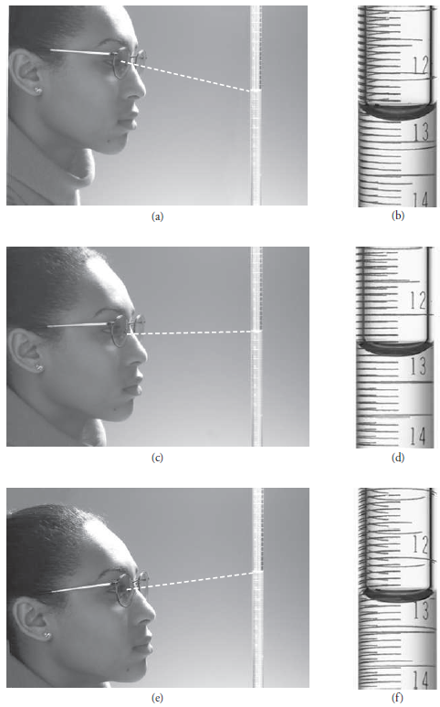 Figure 1 Reading a buret. (a) The student reads the buret from a position above a line perpendicular to the buret and makes a reading (b) of 12.58 mL. (c) The student reads the buret from a position along a line perpendicular to the buret and makes a reading (d) of 12.62 mL. (e) The student reads the buret from a position below a line perpendicular to the buret and makes a reading (f ) of 12.67 mL. To avoid the problem of parallax, buret readings should be made consistently along a line perpendicular to the buret, as shown in (c) and (d)