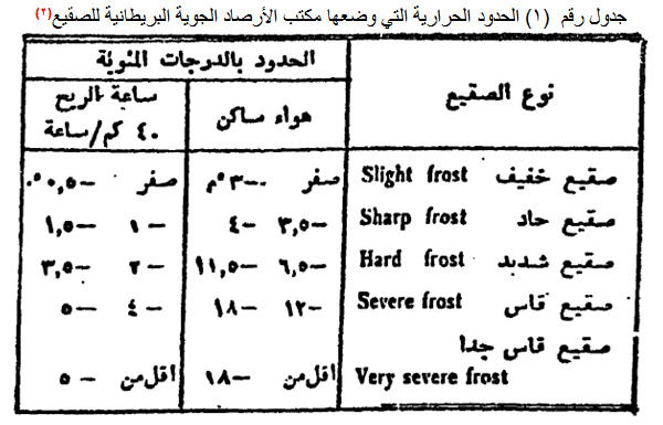 ولكن كلمة صقيع تستخدم في الوقت الحاضر بمعنى أوسع من معناها الأصلي الذي سبقت الإشارة إليه، فهي تطلق الآن على أي انخفاض في حرارة الجو يؤدي إلى هبوطها إلى درجة الصفر المئوي أو إلى ما دونها حتى ولو لم يؤد هذا الانخفاض إلى ظهور المادة الثلجية البيضاء، وتقدر شدة الصقيع عادة على أساس مقدار انخفاض درجة الحرارة عن الصفر، ويلاحظ أن سرعة الرياح تزيد عادة من قسوة البرودة، فدرجة الحرارة 5 م مثلا تكون أشد تأثيرا وخطرا على النباتات إذا كانت الرياح شديدة منها إذا كان الهواء ساكنا، ويتبين هذا من الجدول (1) ويعتبر الصقيع من أخطر الظاهرات الجوية على حياة النباتات، وخصوصا الأنواع الحساسة منها، مثل الأزهار والفواكه والخضراوات، ولهذا فإن محطات. وكثيرا ما يعمد هؤلاء الزراع إلى إيقاد النيران في حدائقهم ومزارعهم لتلافي بعض أخطاره، كما هي الإذاعة والتلفاز في البلاد التي تتعرض كثيرا لظهوره تذيع باستمرار إنذارات للزراع في حالة توقع ظهوره في بعض الليالي الحال في الولايات المتحدة.