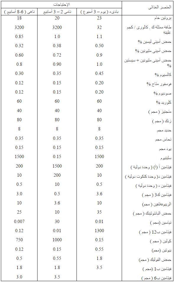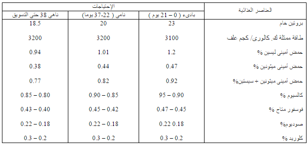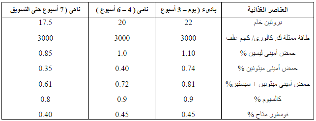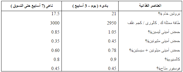 يوضح الجدول التالي احتياجات كتاكيت التسمين من العناصر الغذائية المختلفة طبقاً للقرار الوزاري ( وزارة الزراعة المصرية ) لسنة 1996.