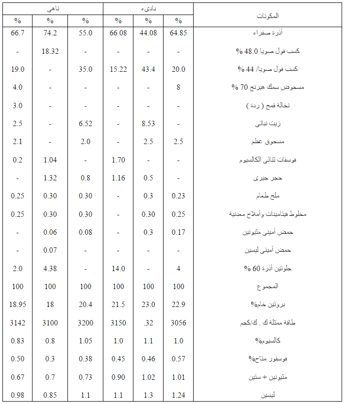 المصدر: صلاح ابو الوفا احمد علي, عبده جاد محمد عبد الله, دليل المربي في تغذية الطيور الداجنة,2004. الادارة العامة للثقافة الزراعية. وزارة الزراعة واستصلاح الاراضي.