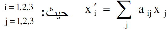 حيث ان Xʹ تمثل متجه الموضع المحول مع مركباته (3ʹxʹ1, xʹ2, x) وان X متجه الموضع الاصلي مع مركباته (x1, x2, x3) وان A تمثل مصفوفة التحويل بعناصرها aij ونكتب :