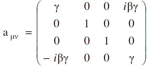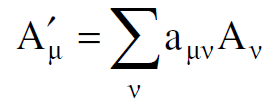 فالكميات الاربع هي (Aμ)، حيث μ =1,2,3,4، وهذه الكميات الاربع تتحول بالطريقة نفسها التي تتحول فيها الاحداثيات .. بالنسبة لتحويلات لورنس. وهكذا تكتب معادلة التحويل الاتية :