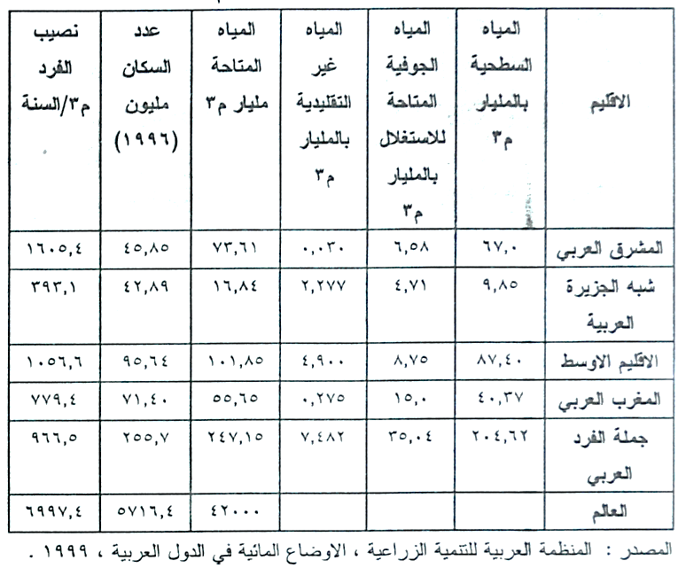 الزراعي. ومن ناحية اخرى فان نصيب الفرد من المياه يتناقص بتزايد عدد السكان فبينما كان المتوسط العام للدول العربية حوالي 1090 م3الفرد عام 2000 ٬ ويقدر ان يصل الى حوالي 900م3الفردالسنة وما دون ذلك مؤشرا لمحدودية المياه حسب احد التصنيفات العالمية. يبين الجدول رقم ﴿1-1﴾ المياه المتاحة ونصيب الفرد م3السنة في الوطن العربي.