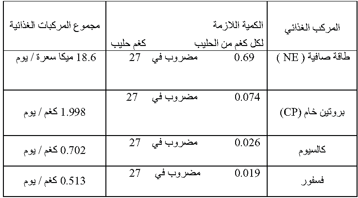 جدول (2) احتياجات انتاج 27 كغم من الحليب في اليوم