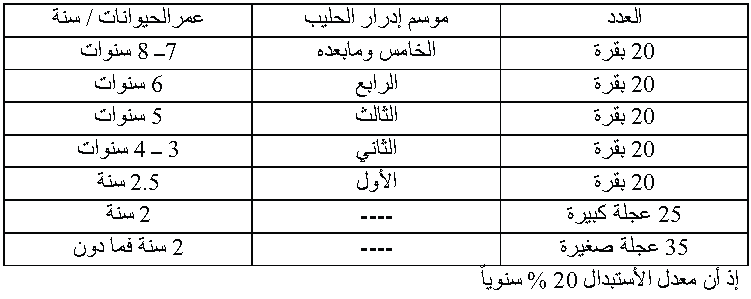 والجدول الآتي يبين قطيع يتكون من 100 بقرة منتجة للحليب وبمواسم مختلفة ومدعومة بأعداد من العجلات بأعمار مختلفة كي تضاف للقطيع عند استبعاد الحيوانات الكبيرة في العمر او المنخفضة الإنتاج. ولا بأس عند تأسيس القطيع لأول مرة من استيراد مجموعة من الاباكير الحوامل (لا يزيد مدة حملها عن 7 شهور)، اذ انه وبعد مدة قد تصل الى 5 سنوات سيتكامل التدريج العمري للقطيع.