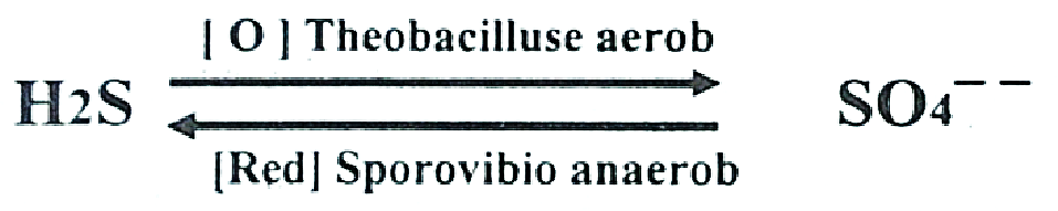 وعند تحول الظروف الهوائية الى ظروف لاهوائية يتم اختزال الكبريتات الى غاز كبريتيد الهيدروجين بواسطة بكتريا sporovibio حسب المعادلة:
