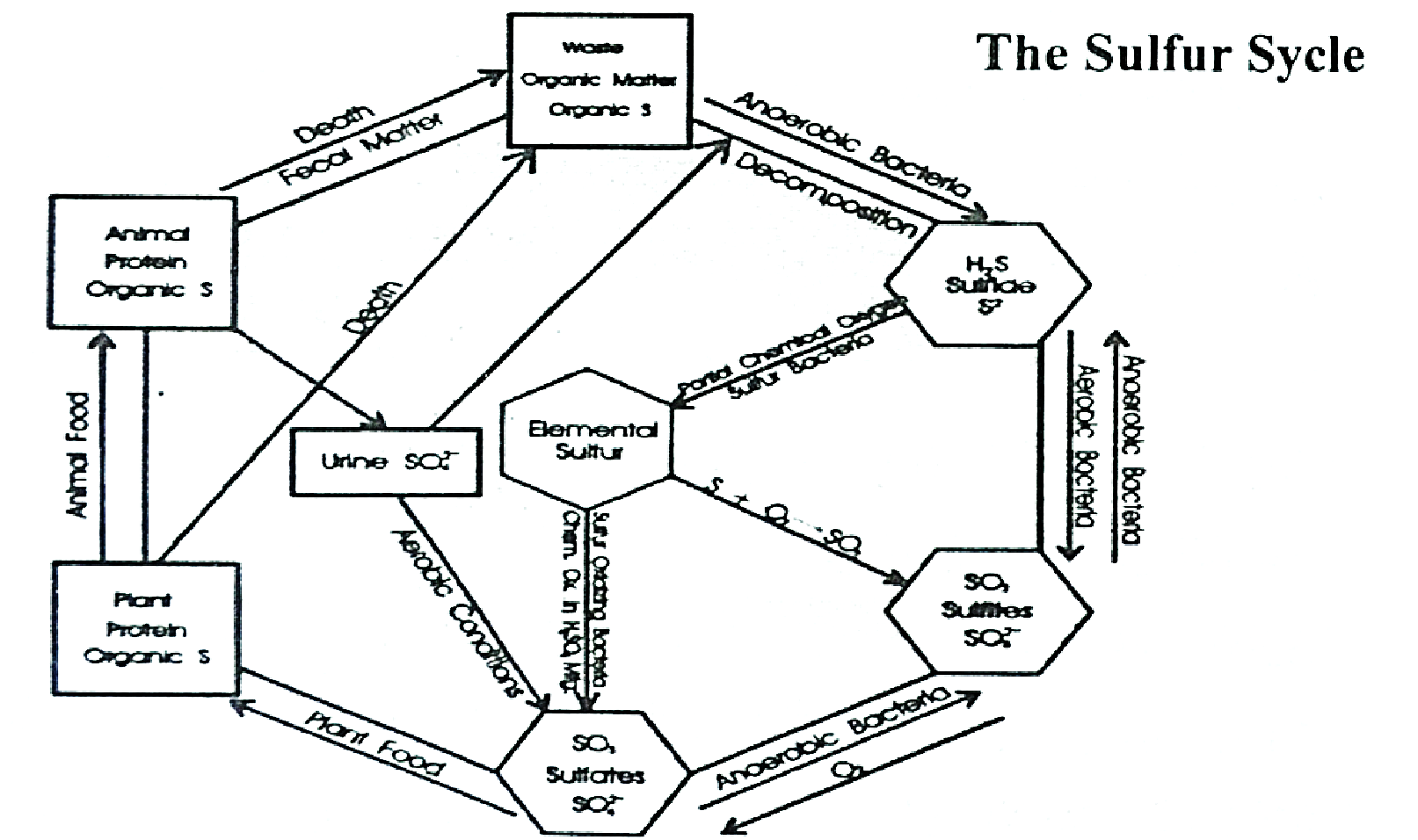 وتأخذ النباتات الخضراء الكبريت من الوسط الذي تعيش به على شكل ايونات الكبريتات so4-- وتستعمله في بناء البروتينات الخلوية. ومن خلال السلسلة الغذائية تستفيد الكائنات الحية الاخرى من هذه المركبات الكبريتية في بناء الخلايا وعند موت الكائنات الحية يتم تحلل المواد العضوية أما هوائيا او لاهوائيا، ففي الظرف اللاهوائية كالتربة الرطبة والمستنقعات ينتج غاز كبريتيد الهيدروجين الذي يلعب دورا اساسيا في البيئة للأسباب الاتية: