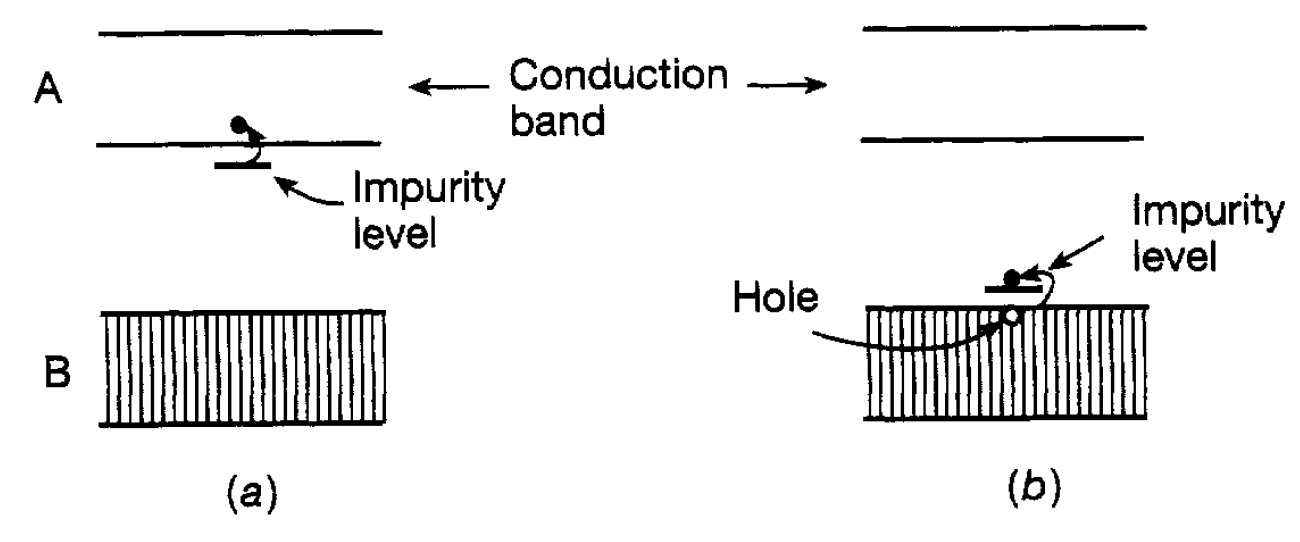In some solids silicon and germanium are important examples the situation arises where band B is full but band A is very close to it. In terms of our discussion about insulators, such a solid should not carry an electric current since the band B is full. However, because band A is very close to band B, electrons from B can sometimes jump into A because of the energy they can acquire from thermal excitation. Clearly, the higher the tempera ture the higher the thermal energy of the electrons and the more likely they are to jump into band A. This band will not have the full complement of electrons allowed by the exclusion principle and therefore behaves as a conduction band so that an electric current can pass. Such a solid, because it can carry a current by this means, is referred to as a semiconductor. Its conductivity is much lower than that of a metal because there are far fewer electrons participating. The conductivity is also very dependent on temperature and a semiconductor resistance can decrease by a factor of around two for every ten degree temperature rise. Its conductivity can also be increased by shining light onto it, the photons in the light giving energy to electrons in band B, enabling them to jump into band A. Such a semiconductor is referred to as a photoconductor. However, the most effective way of increasing the conductivity of a semiconductor is to ‘dope’ it with an impurity, Consider the semiconductor germanium with a small amount of arsenic as an impurity. The arsenic atom is very similar to germanium except that it has an additional electron. If a germanium atom is replaced by an arsenic atom in a germanium crystal then there is a spare electron. It turns out that the energy level of this electron is just below the bottom of the band A as shown in figure 1.1(a). Its energy level is so close to this band that, unless the temperature is very low indeed, thermal energy is enough to cause it to jump into the band and therfore act as a conduction electron. Impurities of a