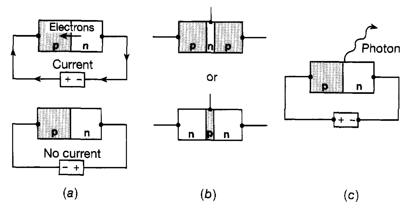 Figure 1.2: Semiconductor devices: (a) a diode; (b) a transistor; (c) an LED.