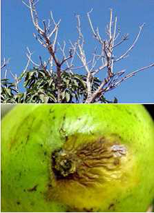 شكل يوضح مظاهر الاصابة بمرض ذبول الاطراف (اعلى الشكل) وعفن الثمار في المانجو (اسفل الشكل)