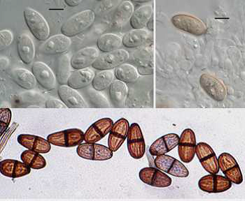 الميسيليوم مقسم لونه بني داكن والفطر يكون أوعية بكنيدية لونها مسود، شكلها كروي أو كالدورق لها بروز تخرج منه الجراثيم الكونيدية، والجراثيم الكونيدية الحديثة شفافة بيضاوية الشكل شفافة تتكون من خلية واحدة وأحيانا من خليتين أما الجراثيم مكتملة النضج فلونها بني داكن تتكون من خليتين تتميزان بوجود خطوط طولية فاتحة اللون على امتداد الخليتين.