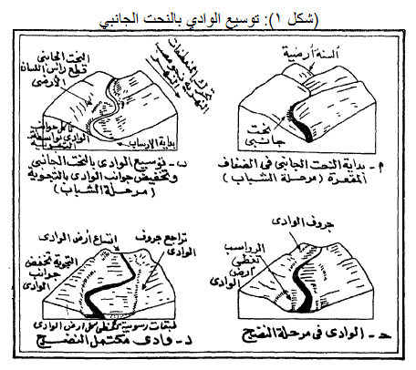 وفي الشكل رقم (1 جـ) ترى الوادي وقد أصبح ناضجاً. فهو يبدو متسعاً تكتنفه الجروف، كما تغطي الرواسب معظم أرضيته.