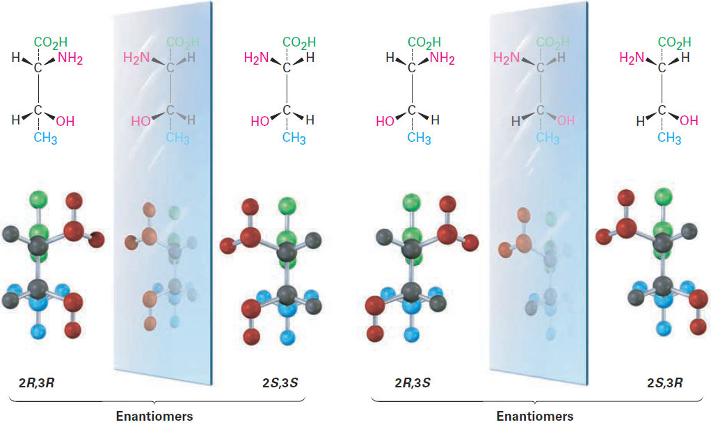 Molecules like lactic acid, alanine, and glyceraldehyde are relatively simple because each has only one chirality center and only two stereoisomers. The situation becomes more complex, however, with molecules that have more than one chirality center. As a general rule, a molecule with n chirality centers can have up to 2n stereoisomers (although it may have fewer, as we’ll see below). Take the amino acid threonine (2-amino-3-hydroxybutanoic acid), for example. Since threonine has two chirality centers (C2 and C3), there are four possible stereoisomers, as shown in Figure 1-1. Check for yourself that the R,S configurations are correct.
