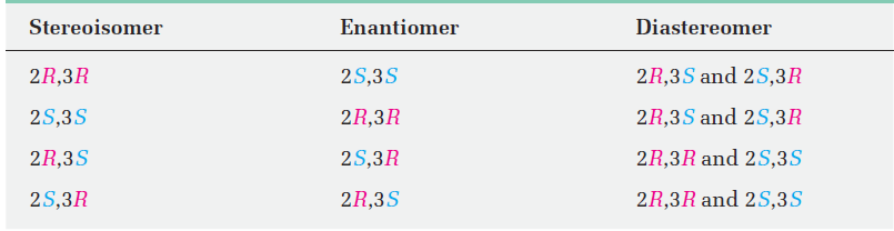 The four stereoisomers of 2-amino-3-hydroxybutanoic acid can be grouped into two pairs of enantiomers. The 2R,3R stereoisomer is the mirror image of 2S,3S, and the 2R,3S stereoisomer is the mirror image of 2S,3R. But what is the relationship between any two molecules that are not mirror images? What, for instance, is the relationship between the 2R,3R isomer and the 2R,3S isomer? They are stereoisomers, yet they aren’t enantiomers. To describe such a relationship, we need a new term—diastereomer.