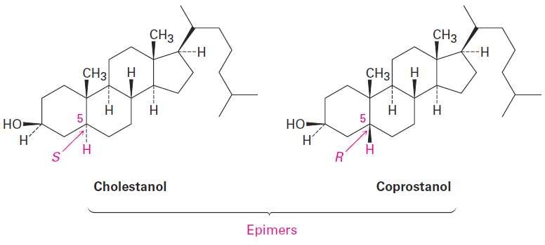 Cholestanol and coprostanol, for instance, are both found in human feces, and both have nine chirality centers. Eight of the nine are identical, but the one at C5 is different. Thus, cholestanol and coprostanol are epimeric at C5.