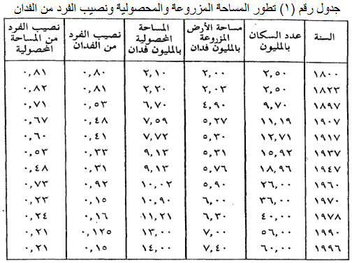 4- رغم التوسع الزراعي الأفقي والرأسي، فإن التزايد السكاني كان سريعاً غالباً والنتيجة، كما يوضحها الجدول، استمرار انخفاض نصيب الفرد، الى أن وصل الى نسبة متدنية سيئة مقدارها 0,125 من الفدان، أي نحو ثلاثة فراريط فقط، بعد أن كان في مطلع القرن العشرين نحو 17,04 قيراطاً، أي نصيب الفرد في نهاية القرن العشرين هبط الى سدس نصيبه في بداية ذات القرن العشرين.