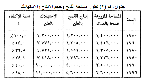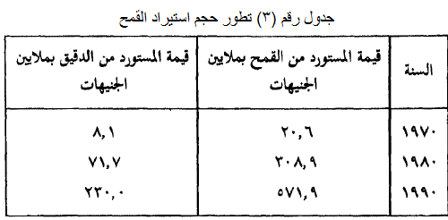 والجدول السابق (رقم 2) يوضح تطور مساحة الأراضي المزروعة قمحاً من عام 1950 وحتى عام 1996، وحجم الإنتاج والاستهلاك, وعلى الرغم من أن نسبة التغير أو الزيادة الانتاجية لفدان القمح وصلت الى 305% فيما بين عامي 1950 (5,18 أردب) وعام 1996 (15 أردبا)، فإن الزيادة المطردة السريعة للسكان، لم تكفها هذه الزيادات الإنتاجية، وكان لزاماً على الحكومة أن تستورد محصولات غذائية أهمها القمح, والجدول التالي (رقم 3) يوضح تطور حجم الاستيراد من القمح خلال عشرين عاماً.