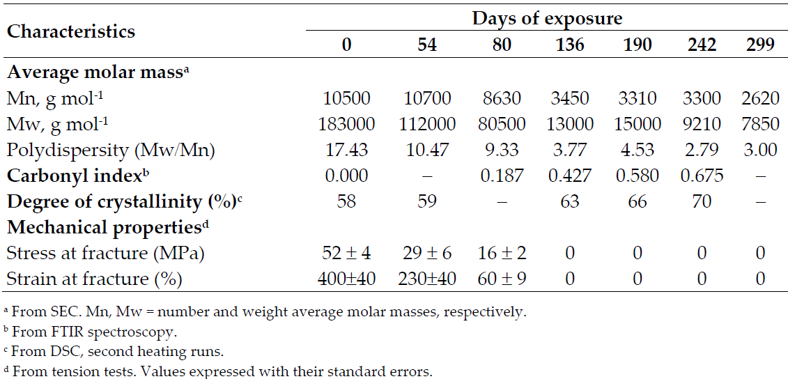 In Table 1, it is possible to observe the changes in molecular weight and carbonyl concentration, as well as the consequent changes in mechanical properties, that occur with the outdoor weathering of films of a HDPE/LDPE blend for several months. The increase in crystallinity can be explained by the higher freedom of motion of smaller polymer chains, that could be rearranged in more crystalline structures.