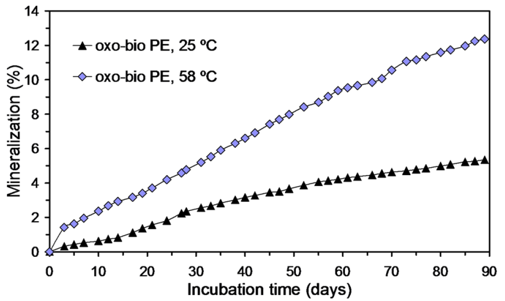 The rates of biodegradation of the residues from oxo-biodegradable materials are usually lower than those of most hydro-biodegradable materials. It generally takes a few years to quantitative biodegradation of the oxo-bio materials, depending on resin type, environmental conditions and formulation of additives used. Figure 1 shows the mineralization curves for an oxo-biodegradable HDPE/LLDPE blend biodegraded in composting conditions at two different temperatures. After a certain level of oxidative degradation, biofilms can be observed on the oxidized polymer residues. These biofilms mainly consist of fungi and bacteria, although archaea, algae and protozoa may also be present. The oxo-bio materials may be recycled with conventional polymer materials, provided that the resins still contain antioxidant additives in concentration sufficient to prevent oxidative degradation during processing and service life. Some people consider that the residues of oxo-biodegradable polymers contain toxic metals, but so far there is no evidence of toxicity of them to plants or animals. Instead, the cations of Fe, Co and Mn are micronutrients, acting as cofactors of enzymes. At very high concentrations, these cations may damage the plants, even because they increase the osmotic pressure of the environment and may dehydrate the root cells.