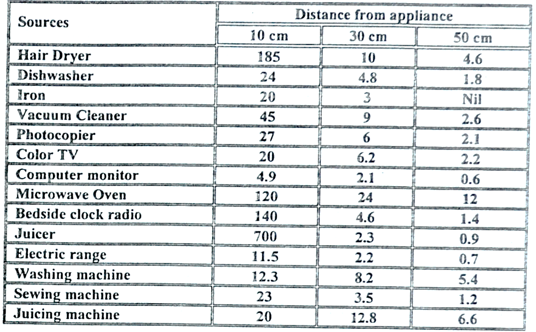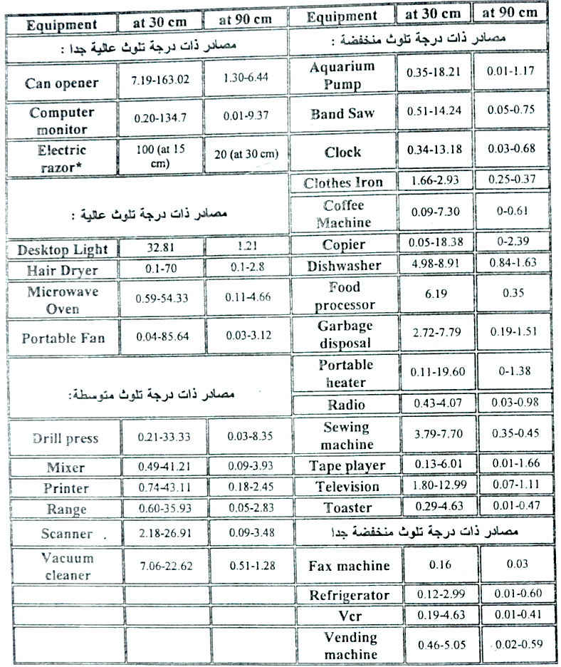 جدول يوضح قيم التلوث الكهرومغناطيسي حول بعض المصادر
