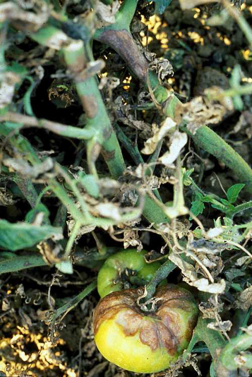 شكل يوضح اعراض الاصابة بمرض الندوة المتأخرة على الطماطم