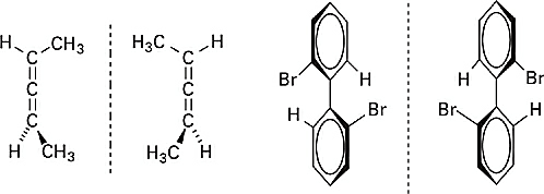 Figure 1.1 Compounds that are chiral by virtue of a chirality axis. The compounds at left are examples of allenes in which a central sp hybridized carbon is joined via orthogonal π bonds to two sp2 hybridized carbon atoms. The compounds at right are enantiomers in which the large bromine atoms prevent free rotation about the C–C bond connecting the aryl rings.